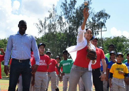 Milagros Cabral, directora de Deportes del Distrito Nacional, acompañada por el viceministro Soterio Ramírez el inmortal Juan –Piñao- Ortiz, hizo el lanzamiento de la primera bola.
