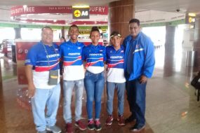 Los atletas juveniles Melvin Rafael Martínez Fernández, John Manuel Peña Castillo y Loraine Eugenia Contreras Fernández están acompañados de Franklin de la Cruz, presidente de la Federación Dominicana de Triatlón (Fedotri)